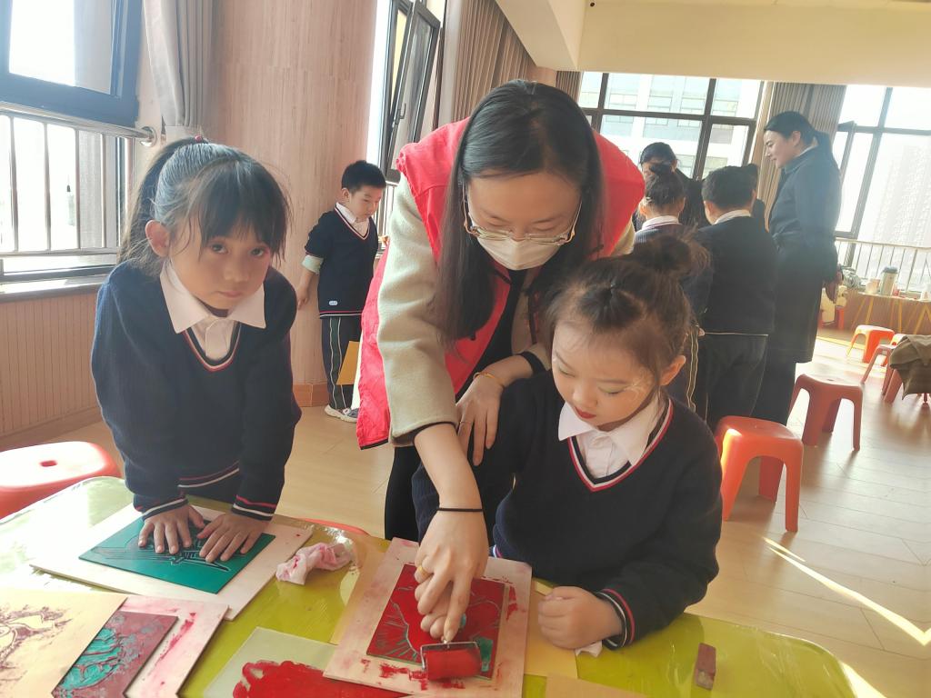 幼儿园小朋友们以优美的舞蹈《幸福的远方》拉开了此次活动的序幕。活动现场,艺术设计系党支部志愿者为幼儿园师生介绍了拓印历史及制作流程,和大家一起挑选了“人民的小推车”“雷锋头像”“莲花”等拓印底板,手把手指导孩子们完成拓印作品,引导大家传承非遗技艺,感受劳动之美。