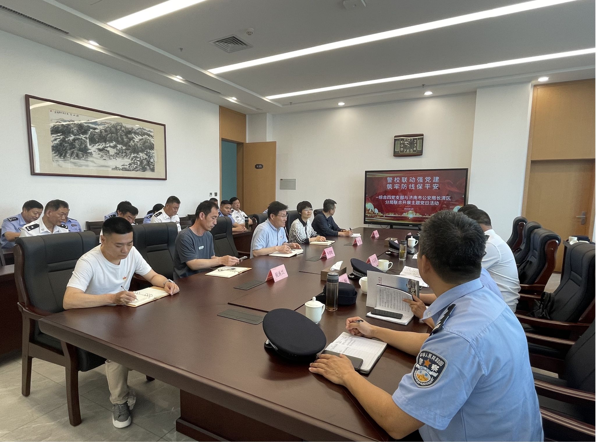 5 月22日上午,学院综合四党支部与济南市公安局长清区分局警务保障处党支部、政保大队党支部及高校专班全体党员,联合开展“警校联动强党建,筑牢防线保平安”主题党日活动。活动在学院537会议室、党建文化展厅、学院展览馆、廉洁文化长廊及东门广场等区域有序开展,双方党员代表共计50人参与。