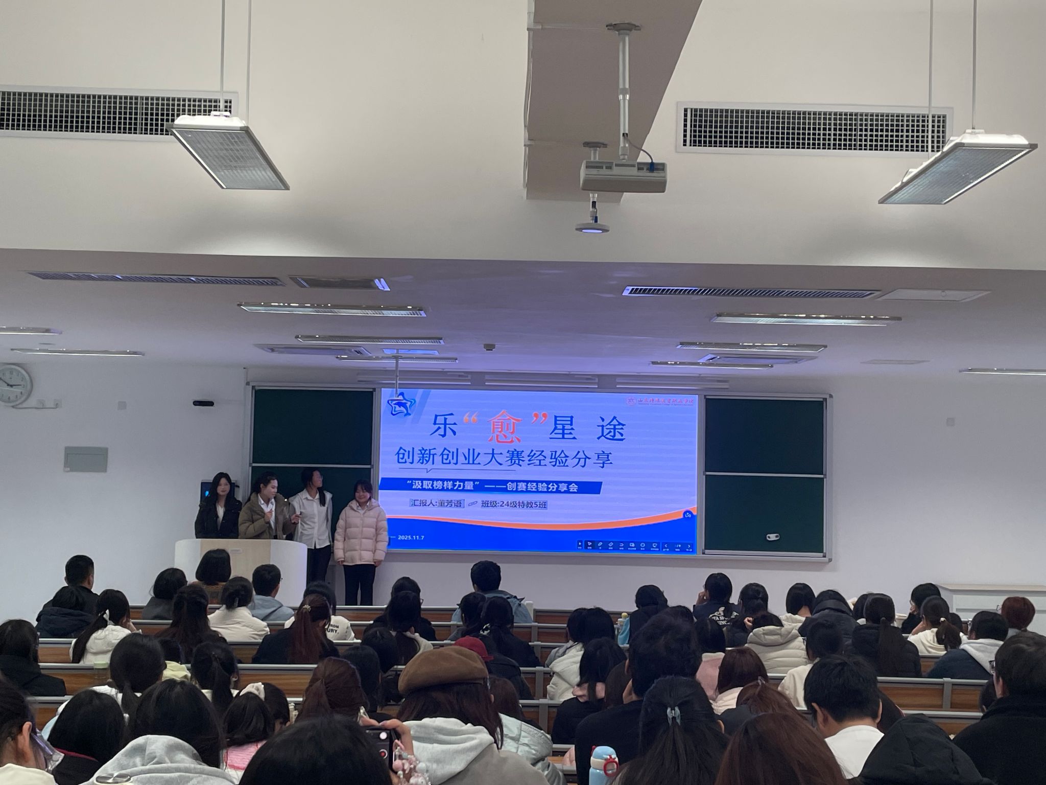 各项目团队的分享字字珠玑。从灵感萌芽到方案落地的艰辛与坚持,从聚焦社会需求、将爱心与创新结合的实践路径,到参赛中的细节把控与心态调整,从备赛时的熬夜打磨、答辩中的临场应变、失利后的复盘总结,到获奖时的并肩欢呼。真实的体悟引发全场强烈共鸣,实用的技巧让同学们直呼“收获满满”,掌声一次次响起,互动提问氛围热烈。青春向上的活力、敢闯敢创的劲头、奋发有为的担当、赶学比超的传承,在这一刻明艳闪亮,同学们参与创新创业活动的热情愈加高涨。