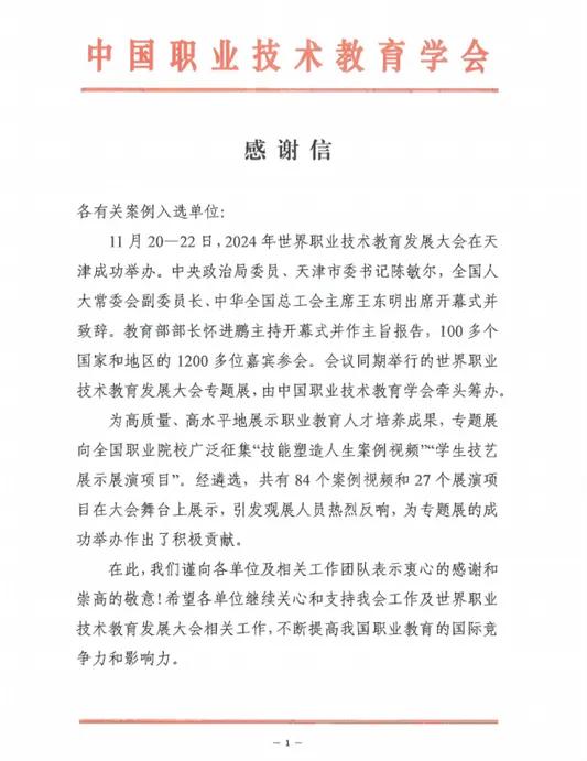 近日,中国职业技术教育学会发来感谢信,感谢学院报送的微视频《织梦非遗》入选2024年世界职业技术教育发展大会“技能塑造人生案例视频”专题展。