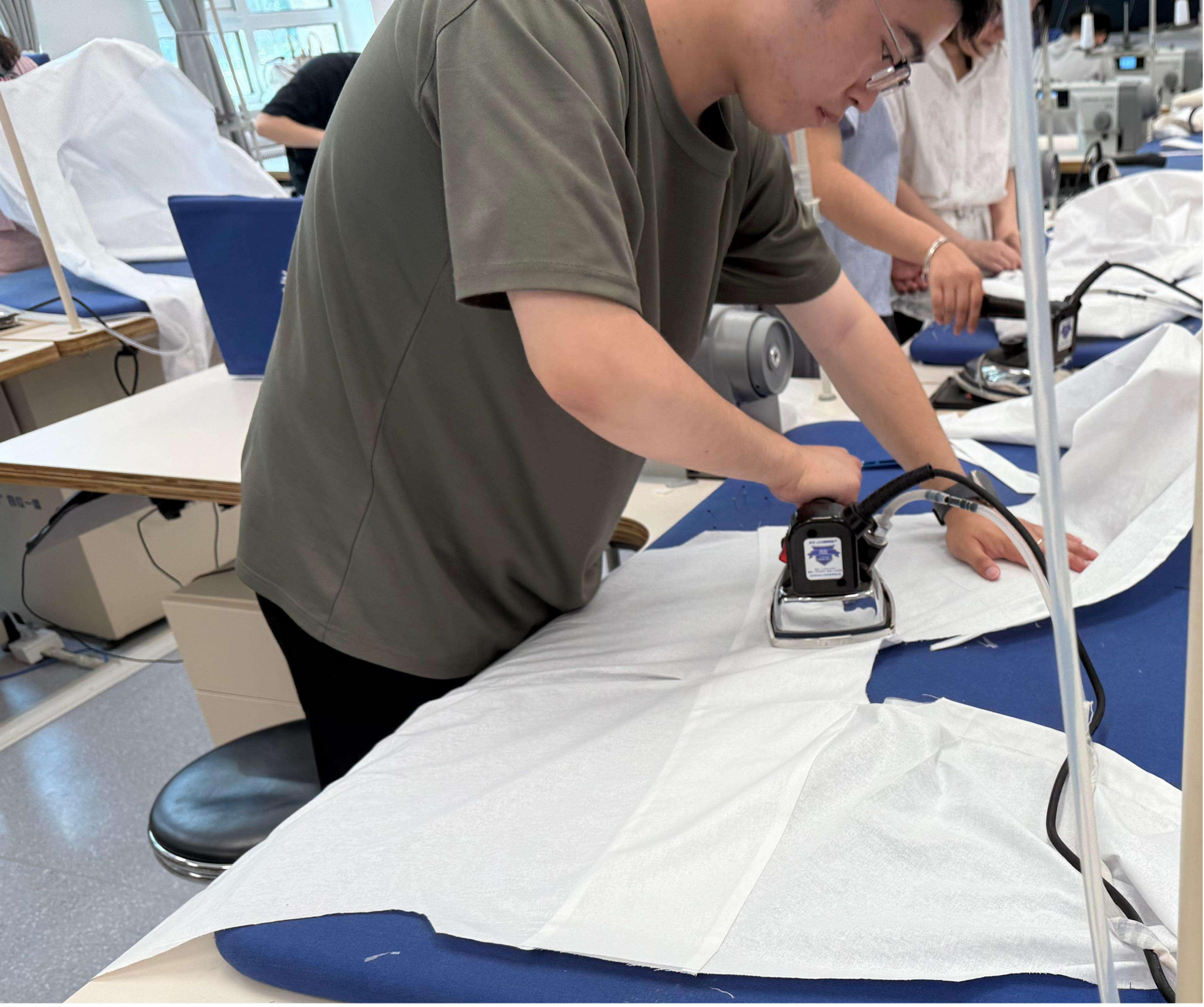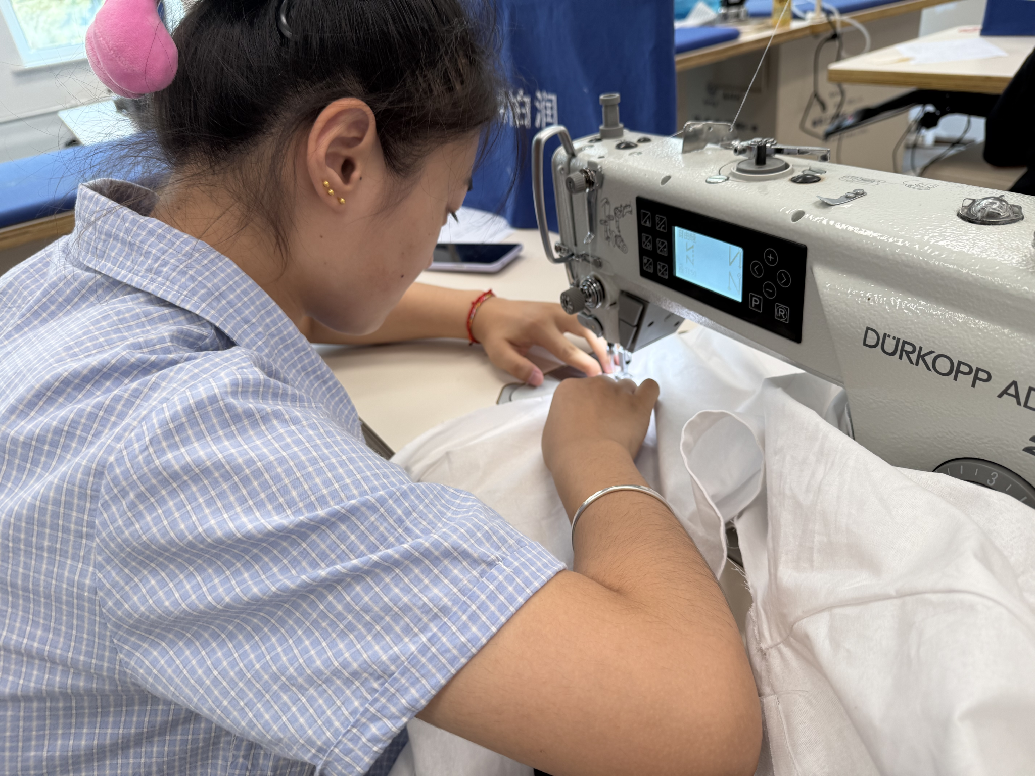 时装技术项目中,选手需在规定时间内完成从款式设计、制版到裁剪缝制的全流程操作,重点考察选手对服装制作全工序的掌控能力与应变水平;比赛过程中,选手们手持画粉在布料上勾勒线条,缝纫中精准把握省道处理,最终完成时装的制作任务。