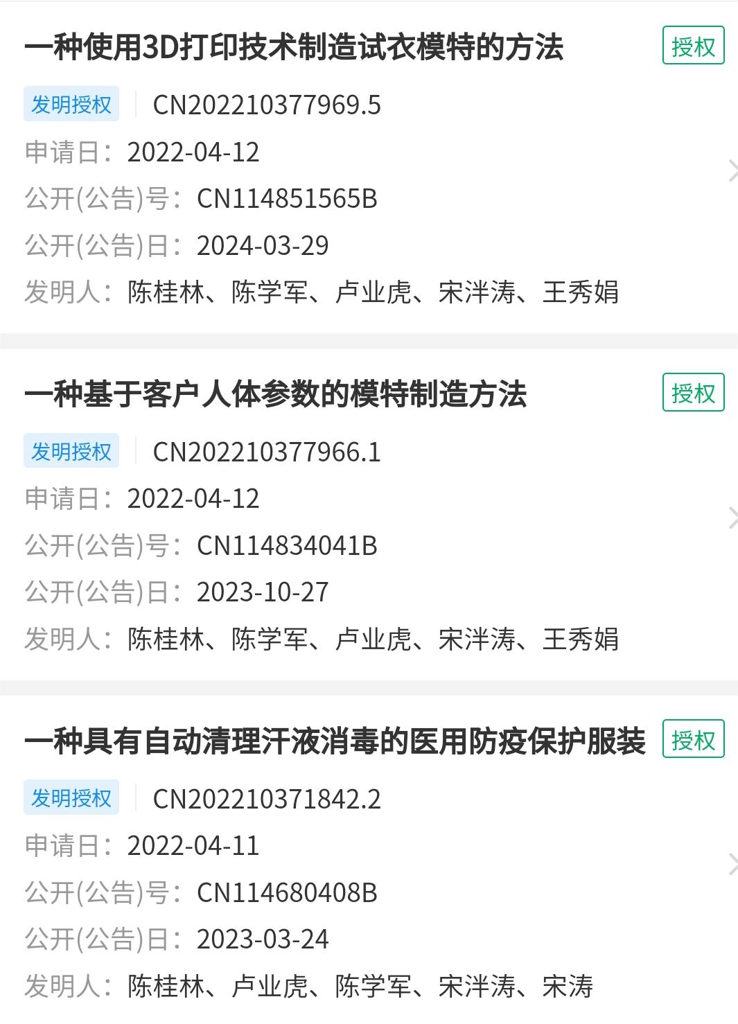 截止至2024年6月份,服装艺术系专业带头人宋泮涛获授权发明专利3项。《一种基于客户人体参数的模特制造方法》于2023年10月获授权;《一种使用3D打印技术制造试衣模特的方法》于2024年3月获授权;《一种降低辐射危害的安全型智能穿戴服饰》于2024年6月获授权。
