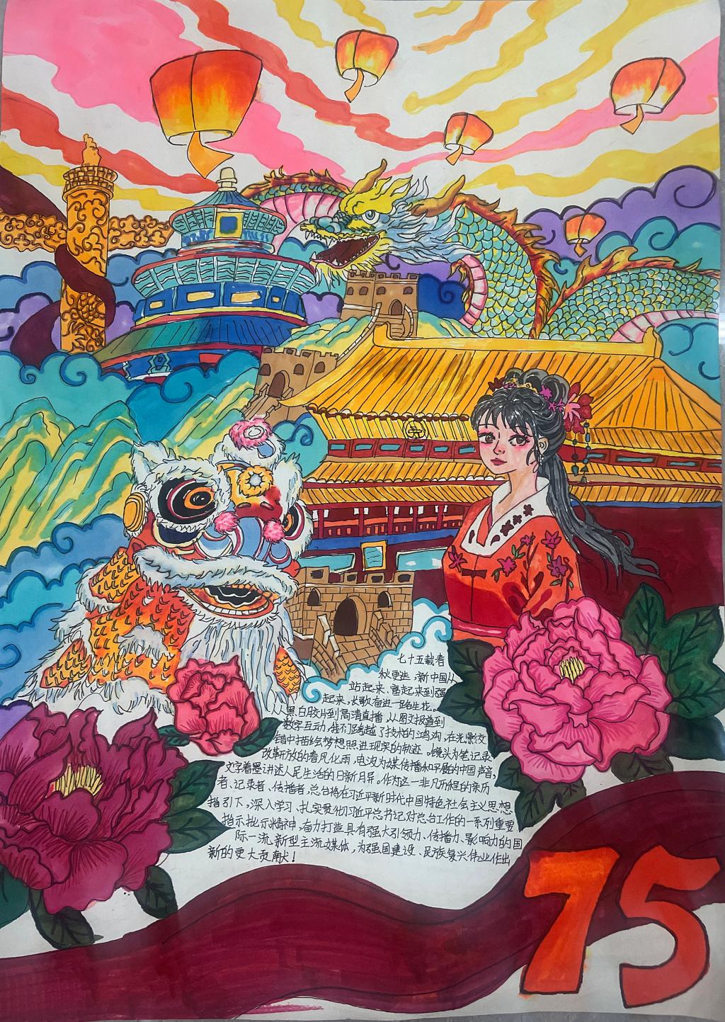 为庆祝中华人民共和国成立75周年,深入学习党史,弘扬爱国主义精神,激发同学们的爱国热情,同时展示新时代青少年的风采,营造浓厚的校园文化氛围,11月28日服装艺术系团总支开展了以“庆祝中华人民共和国成立75周年”为主题的手抄报活动。
