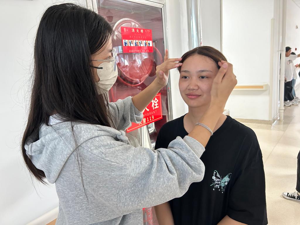 拍摄前,学生志愿者组织学生有序排队,耐心提醒学生拍摄要求及注意事项,按照拍摄要求为新生整理好仪容仪表,如整理衣帽、发型、提前摘下助听器等。