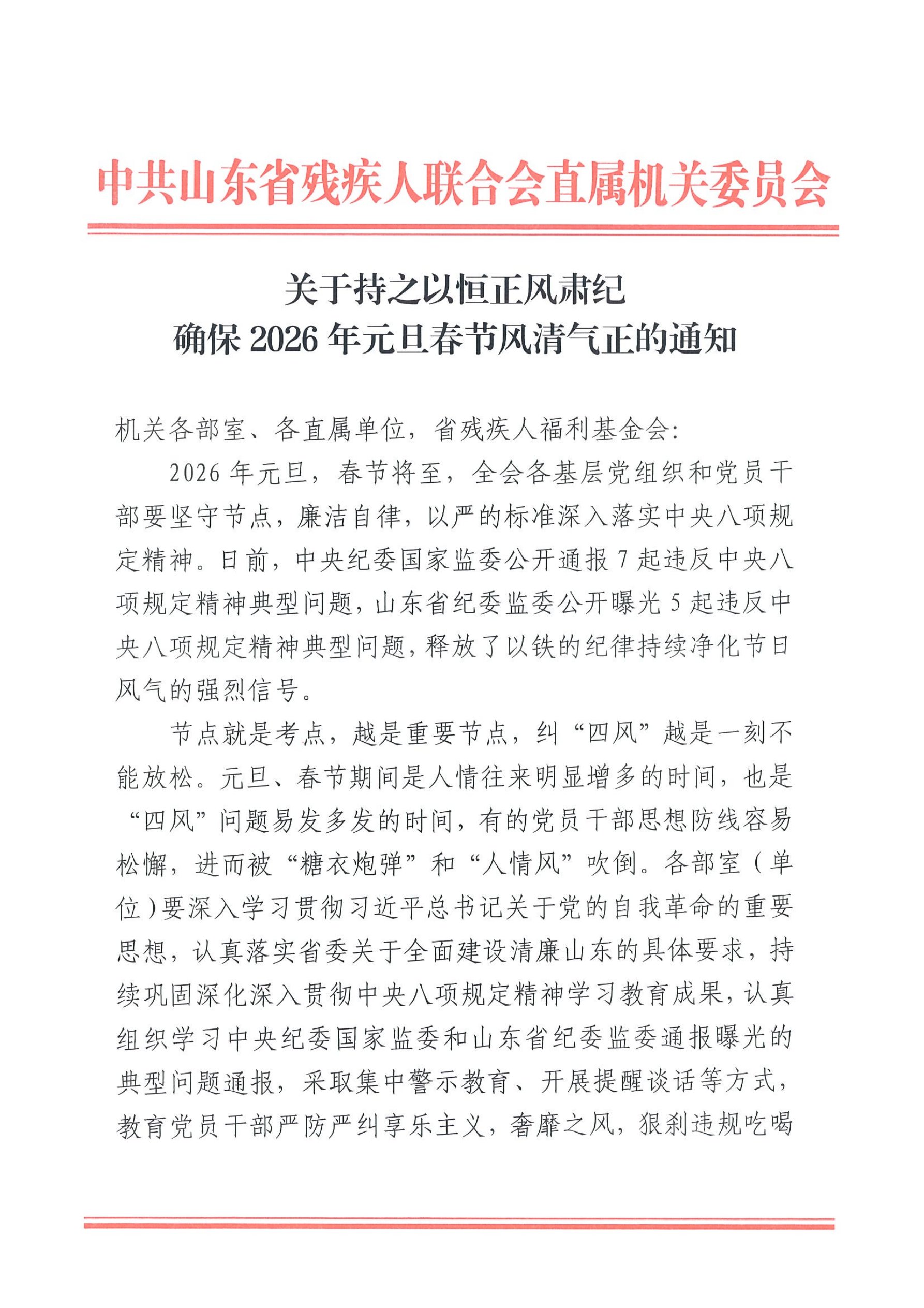 关于持之以恒正风肃纪确保2026年元旦春节风清气正的通知