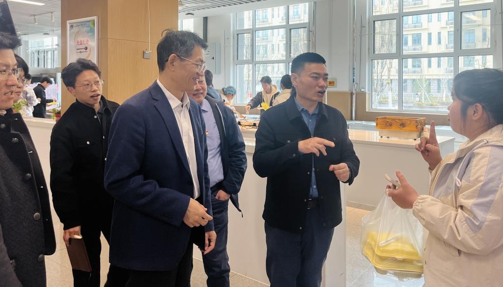 在食堂一楼餐厅,李心沁与学生们亲切交谈,了解学生的就餐情况,询问学生们饭菜是否可口、价格是否满意,听取学生们对食堂伙食的意见和建议。
