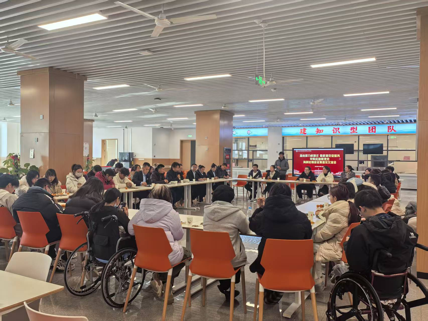 为深入践行“主动服务、精准服务、热情服务”理念,切实提升校园物业服务质量和水平。12月15日下午,后勤管理处联合学生工作处在食堂3楼召开2025年物业服务学生代表座谈会。会议聚焦学生关切的实际问题,面对面听取意见建议,共商优化服务措施。学生工作处、后勤管理处、物业管理服务公司主要负责人及各系部50余名学生代表参加座谈。