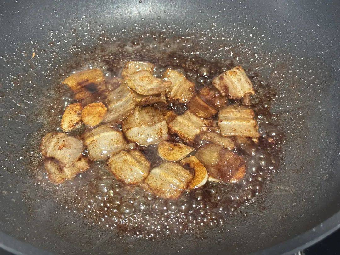 3、再给五花肉调味:加入姜蒜炒香,再加入1勺生抽、半勺老抽、适量姜粉、适量白胡椒粉翻炒至上色,加入小碗开水,焖10来分钟,这样五花肉口感更好!