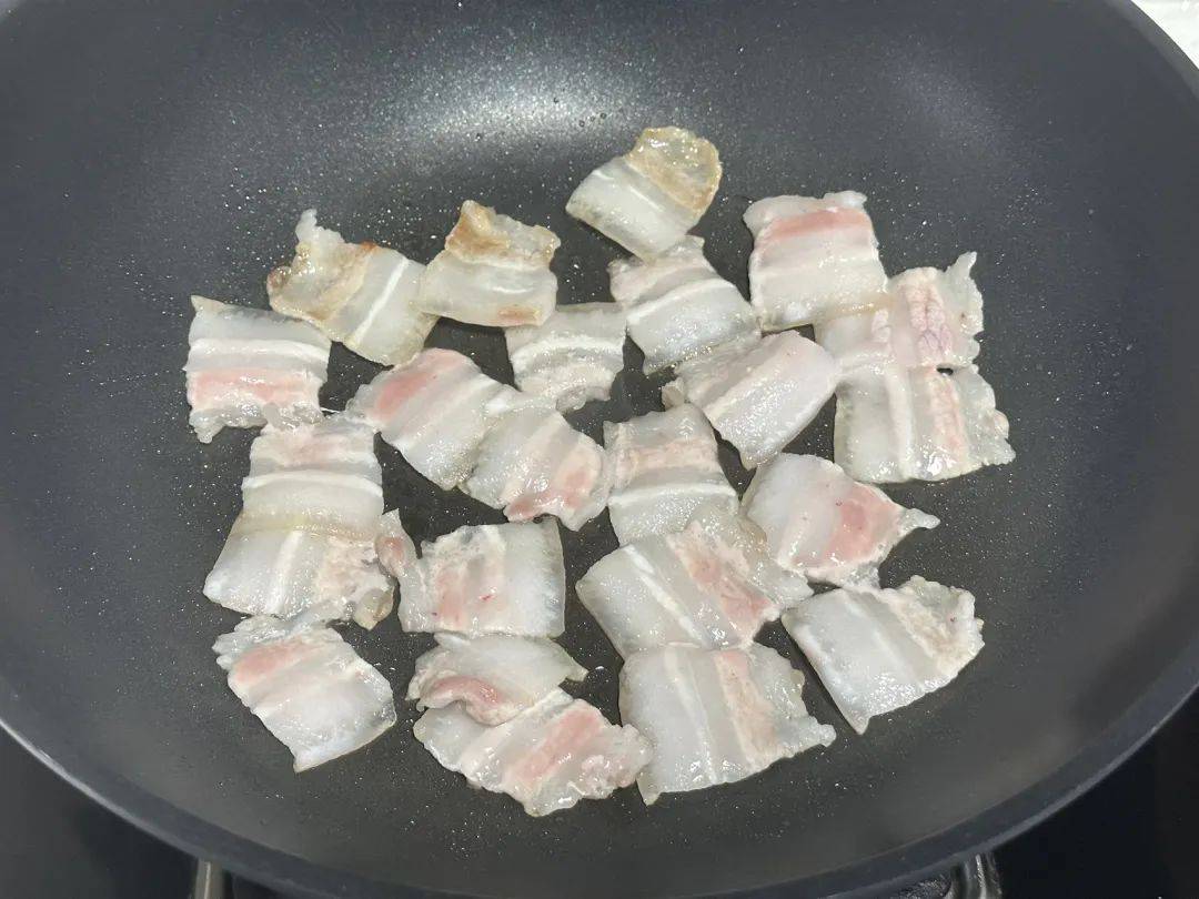 2、锅中不需要加油,把五花肉加进去慢慢煎出油脂,如果油足够多就不需要再额外加油了,油脂不多可以再补一点油进去;