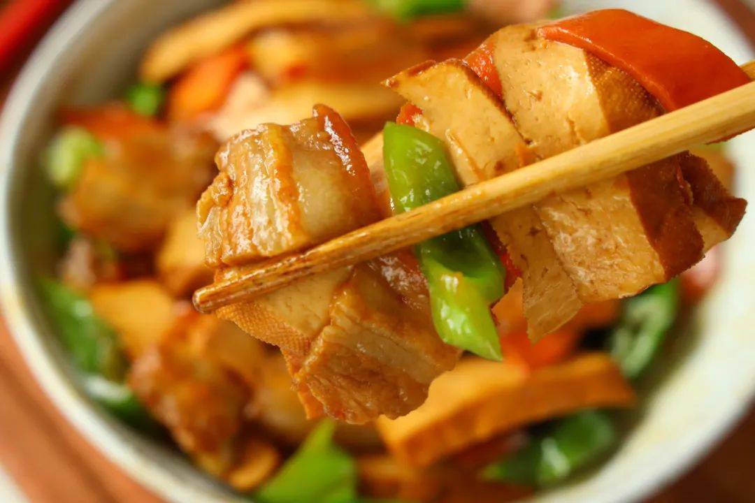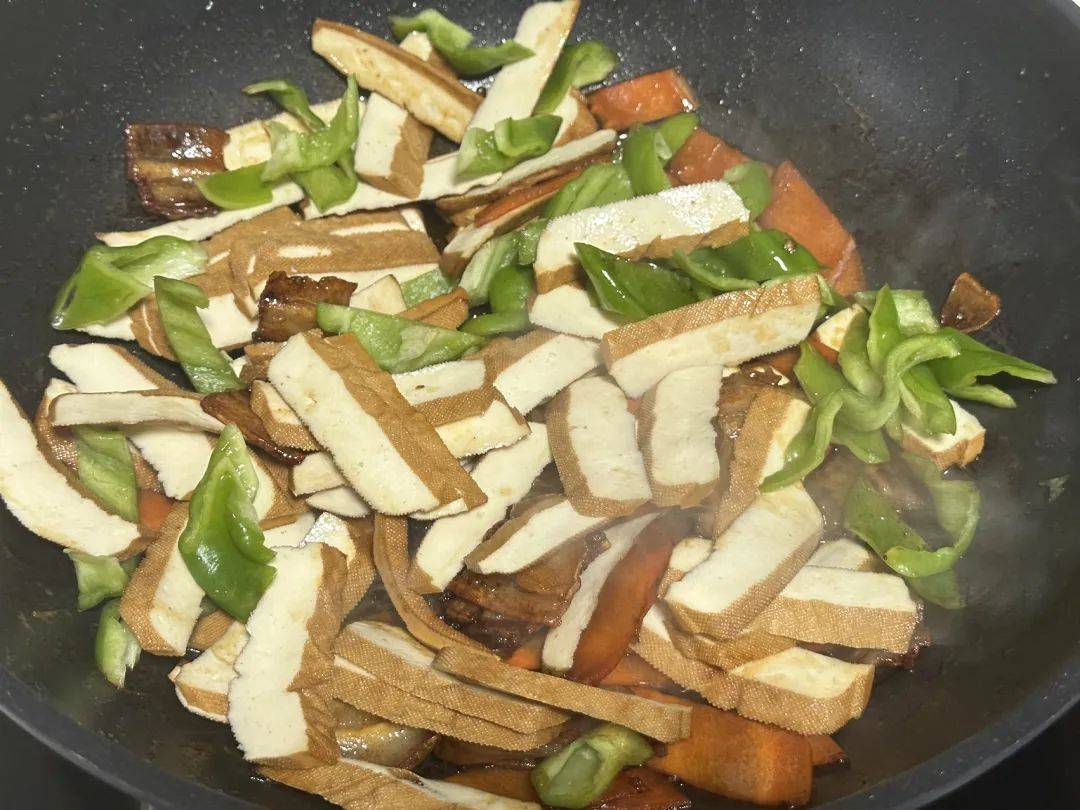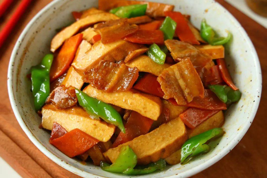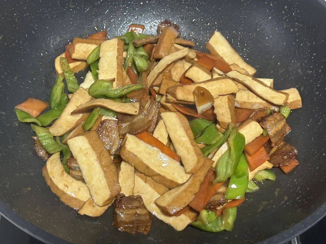 这盘菜端上桌的瞬间,谁不得夸句“好颜色”!琥珀色的五花肉泛着油润的光泽,豆干像嫩豆腐般白里透黄,青椒翠绿得像是刚从菜园摘下来的,橙红的胡萝卜片如同散落的宝石。最绝的是出锅前淋的那圈水淀粉,让整盘菜都蒙着层晶莹的亮光,随手拍张照发朋友圈,点赞分分钟破百。