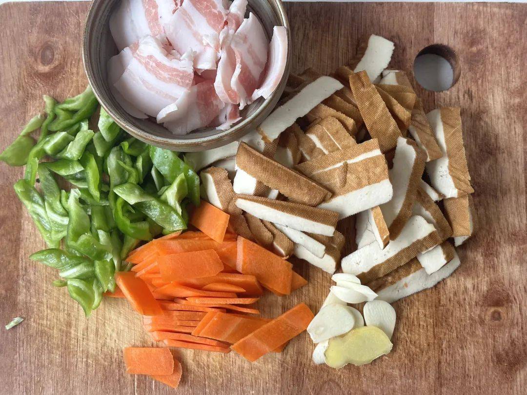 1、准备我们所需要的食材;五花肉切成薄片、豆干斜刀45度角切成片、青椒切块、胡萝卜去皮切菱形片备用,大蒜切片、生姜切片备用;