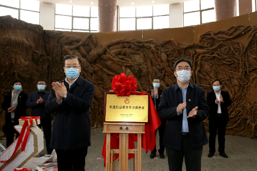 调研活动期间,省委常委、统战部部长张江汀,省残联副理事长、党组成员黄庆峰共同为“山东省中华职业教育社非遗职业教育专业委员会”揭牌。