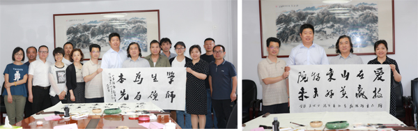 最后,张望主席、郭振宇主任分别向学院赠送了自己的艺术作品集。在大家的簇拥和期待下,大师们现场泼墨挥毫,短短时间内,一幅幅精美的书法、绘画作品便跃然纸上,张望主席题写了《学生为本师德为先》《爱在山东特教技赢美好未来》两幅书法作品,魏百勇秘书长和杨大鲁先生分别创作了两幅水墨丹青,对学院发展寄予了美好的祝福。学院党委班子及教师们向大师们高超精湛的艺术水平和对学院发展的关心关怀报以热烈的掌声和衷心的感谢。(办公室)