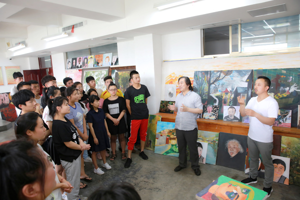 张望一行参观了学院艺术设计系、服装设计系各个工作室和校史馆,与艺术设计系的师生们进行了亲切交流。师生们兴奋地围上来,纷纷把自己的作品拿来请大师点评,大师们从创作理念、技能手法等方面对师生们的作品进行了耐心指导,对个别学生及其优秀作品给予了高度评价,夸赞其具有艺术家潜力,现场氛围非常热烈。在对听障学生作品进行现场指导的过程中,张望鼓励同学们:要以艺术家的标准要求自己,拿出有创造力、想象力的作品,你就是艺术家。在经过学院一处消防栓时,张望随即展开教学:“同学们,你们看看这里面好看吗?”引导听障生建立审美思维,并讲解艺术创作产生的过程:“观察自然,不仅仅观察外面的山山水水,也要观察我们周围生活当中体现出的美,方方面面都产生美感,这就是一个作品。”