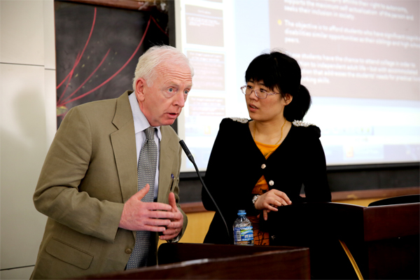 麦克沃先生一行参观了学校各专业工作室和展览馆,他们对琳琅满目的学生作品赞不绝口;对学校的办学特色和管理水平高度认可,希望今后加强校际交流,互派师资相互学习。之后三位专家在学术报告厅举行了关于自闭症儿童康复教育的学术讲座。他们介绍了美国自闭症研究的发展现状、最新研究成果、自闭症儿童的康复治疗、职业教育等情况,展示了一些自闭症患者创作的美术作品。学校特殊教育专业的师生参加了讲座。