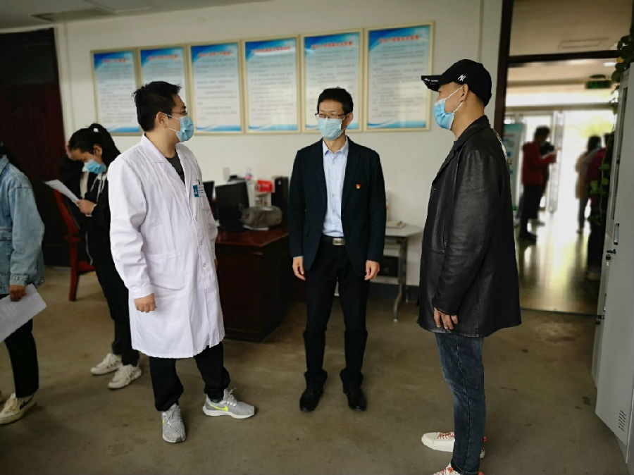 学院院长李心沁,市中区疾控中心主任牛纪伦与社区主任韩建波来到工作现场,了解新冠疫苗接种情况,慰问医务人员并对他们的辛勤工作表示感谢。