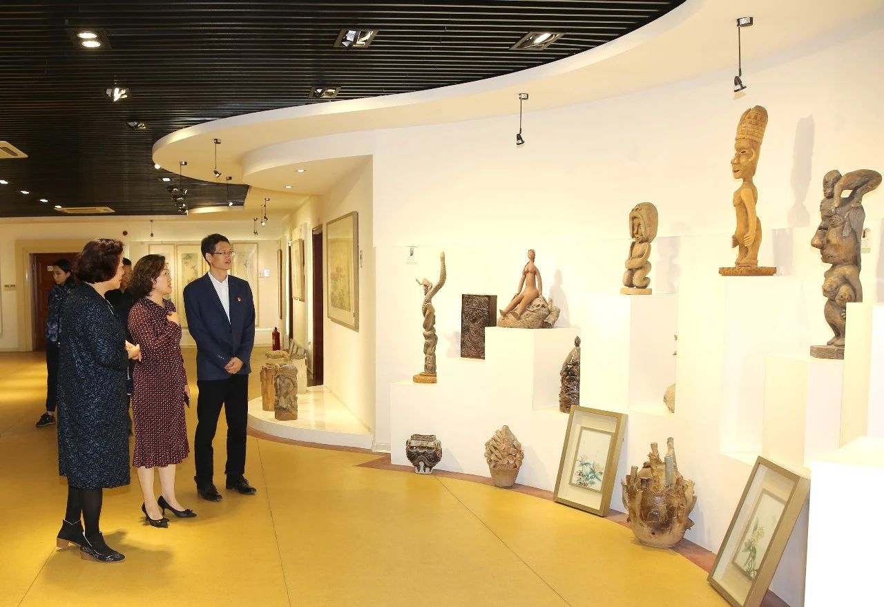 邢成湖一行参观了学院展览馆,对残障学生创作的油画、陶艺、木雕、服装设计等各类作品予以高度评价。邢成湖表示深受震撼,通过艺术作品感受到残疾学生自强不息、热爱生活的精神状态,并表达了对从事特殊教育事业教师的敬佩。