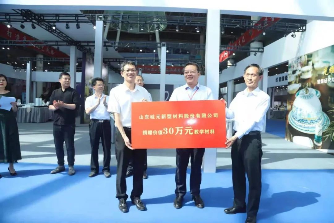 淄博市传统产业发展中心主任赵鹏、山东硅元新型材料股份有限公司董事长殷书建为学院捐赠价值30万元陶瓷教学材料。
