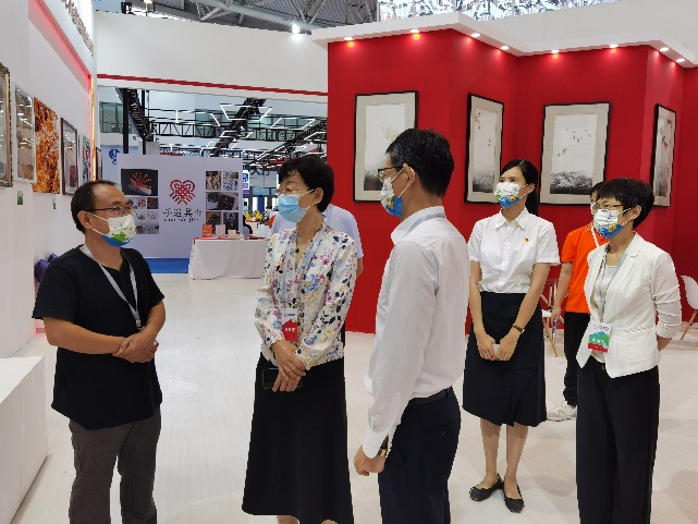 文旅部部长胡和平、省教育厅副厅长孙晓筠、省文联主席潘鲁生莅临学院展区参观指导,学院院长李心沁热情地介绍了学院展区项目。胡和平、孙晓筠一行对学院的人才培养、实践教学、服务产业发展等工作给予了充分肯定,对学院非遗文创作品给予高度评价,并与听障学生亲切交流,一起创作木板印画,感受传统文化和技能之美。