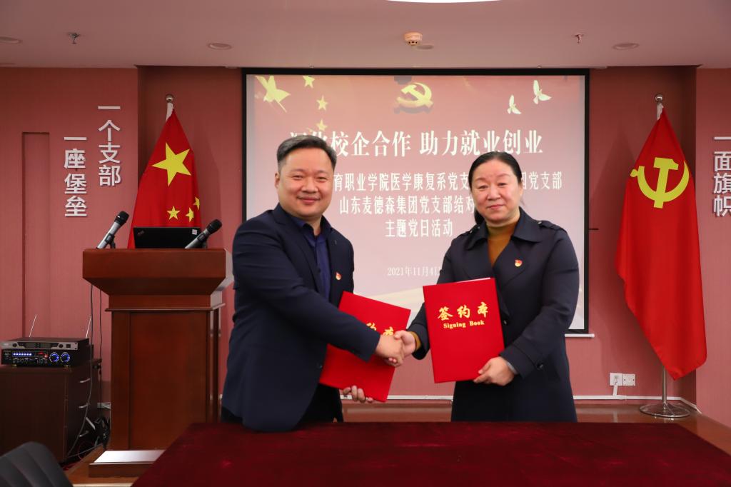 11月4日,学院综合四党支部、医学康复系党支部和山东麦德森集团党支部在山东麦德森集团共同开展以“深化校企合作助力就业创业”为主题的支部结对共建主题党日活动。学院副院长姜欣、山东麦德森集团党支部书记王勇分别带领支部党员参加了此次活动。