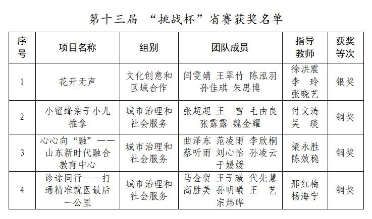 6月9日,由共青团山东省委、山东省教育厅、山东省科学技术协会、山东省学生联合会主办的第十三届“挑战杯”山东省大学生创业计划竞赛落下帷幕。学院4个参赛项目在全省近3万个报名项目的竞争中通过省级复赛,入围决赛,最终收获一银三铜。