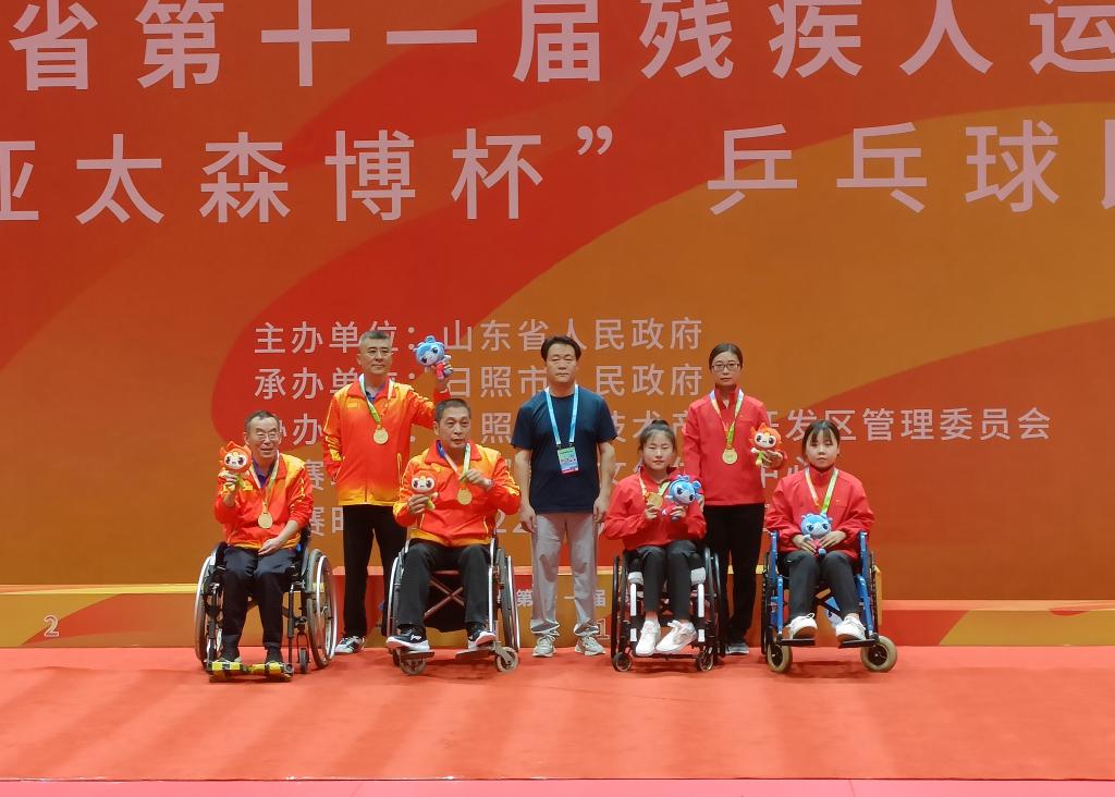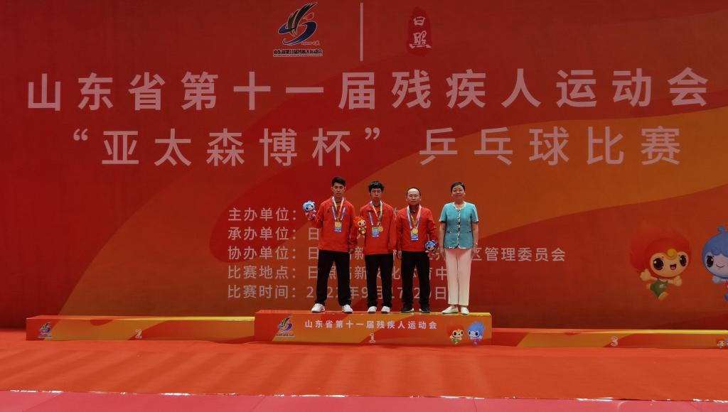 9月17日,在山东省第十一届残运会乒乓球项目开赛首日,学院肢体障碍学生冯俊凯、李思源荣获男子TT8级团体冠军,摘得该项目首枚金牌。随后,肢体障碍学生左雅楠、 陈凤旭荣获女子TT5级双打金牌。省第十一届残运会组委会副主任、省残联党组书记、理事长邹斌芳为学院运动员、教练员颁奖。