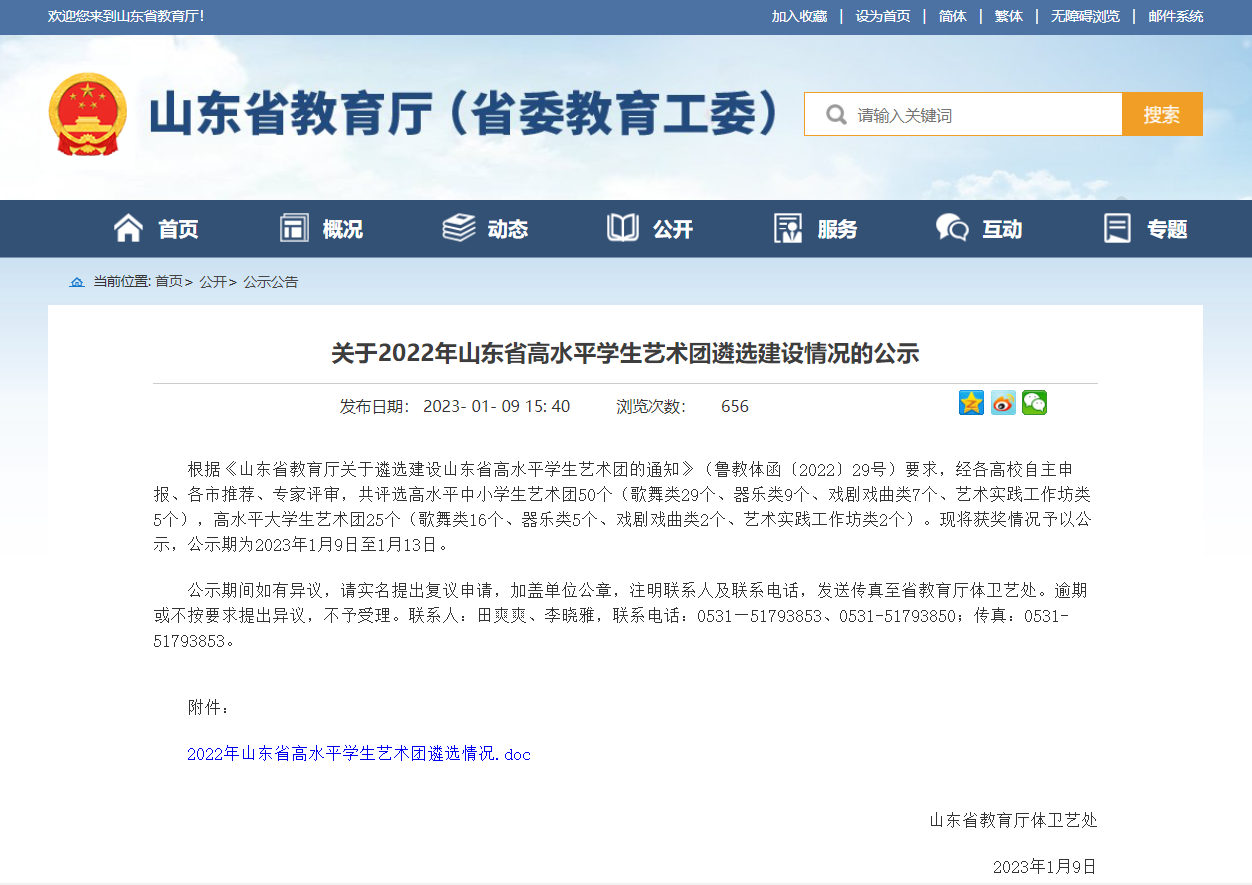近日,山东省教育厅官网公示2022年山东省高水平学生艺术团遴选建设情况,经各高校自主申报、各市推荐、专家评审,共评选高水平大学生艺术团25个,kaiyun开云官方在线入口金石舞蹈团名列其中。