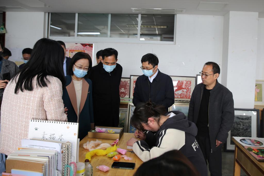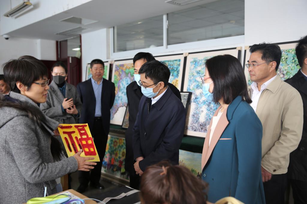 张衍前一行首先来到学院服装艺术系、艺术设计系的实训工作室,深入学生课堂,观看了学生的技能操作以及创作的墩绣、扎染、衍纸、文物修复等精美的艺术作品,深入了解学院的日常教学、培养模式、校企合作等情况,对学院的办学理念、教学成果给与了充分肯定,为教师们的辛勤付出和学生们积极进取、乐观向上的精神面貌点赞。