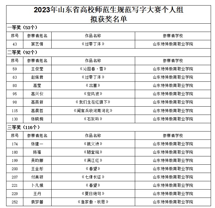 近日,在山东省教育厅、山东省语言文字工作委员会举办的“2023年山东省高校师范生规范写字大赛”中,学院2021级特殊教育专业学生窦艺情获得一等奖,王俊莹等7人获得二等奖,陈禧等8人获得三等奖,学院荣获集体组二等奖,宋建红、李小婷获优秀指导教师奖。