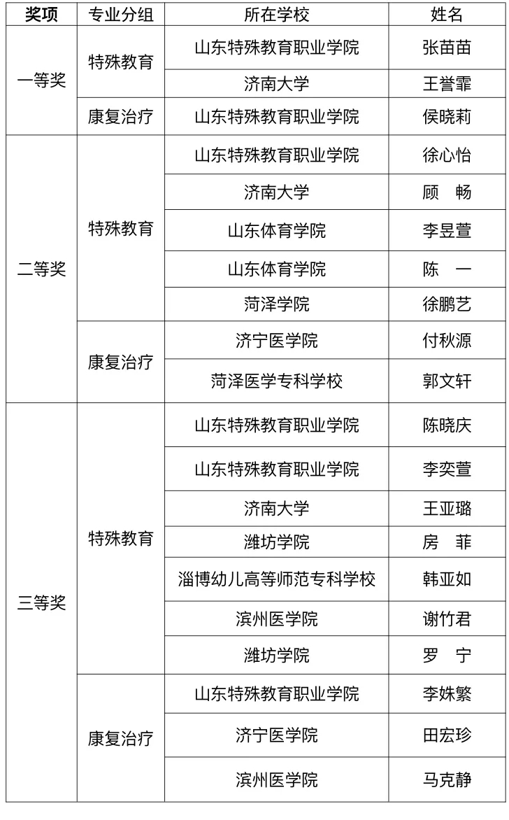 山东省首届高校特殊教育康复技能大赛获奖名单