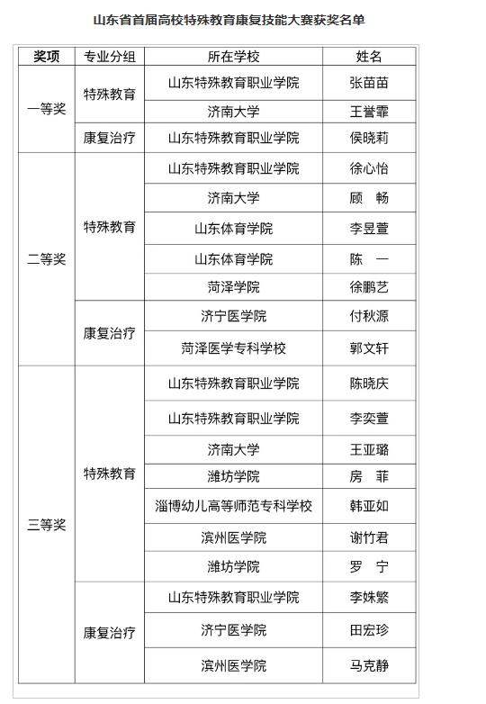 3月31日,由省残联、省教育厅、省卫生健康委联合举办的山东省第二届残疾儿童康复技能大赛暨首届高校特殊教育康复技能大赛落下帷幕。学院特殊教育系、医学康复系参赛学生在首届高校特殊教育康复技能大赛中取得优异成绩,获得2个一等奖、1个二等奖、3个三等奖。