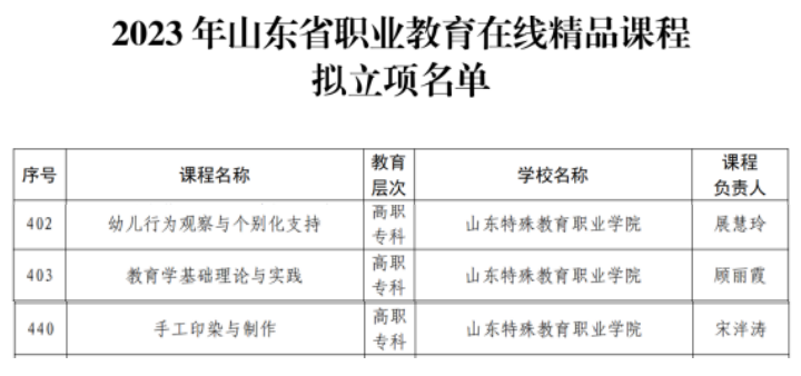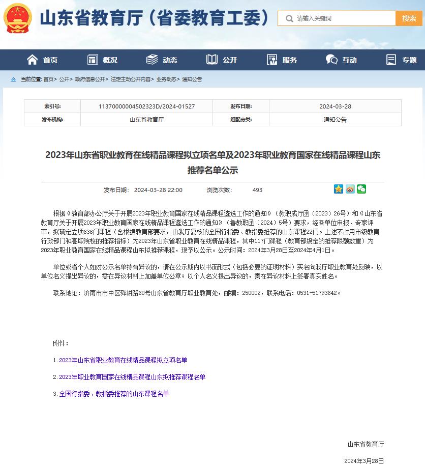 近日,山东省教育厅发布《2023年山东省职业教育在线精品课程拟立项名单及2023年职业教育国家在线精品课程山东推荐名单公示》,学院3门课程成功入选山东省职业教育在线精品课程。