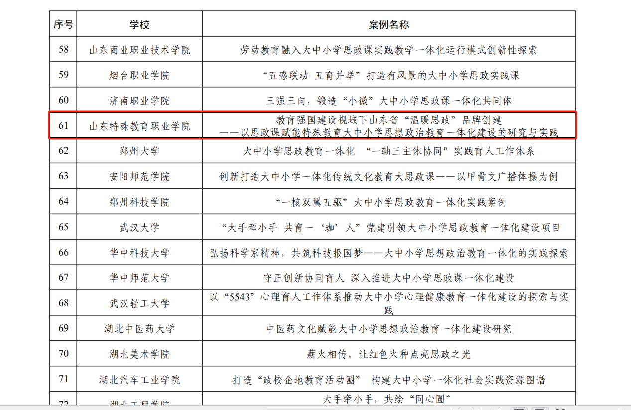 据悉全国共有89所职业院校,共计118个项目入选,其中入选全国大中小学思想政治教育一体化建设工作典型案例的山东职业院校仅有4所。此次项目的遴选旨在培育一批具有全国示范性、引领性的精品项目,为实施新时代立德树人工程提供有力支撑,进一步展示我国高校思政教育的丰硕成果,推动思政教育改革创新,提升思政教育的质量。