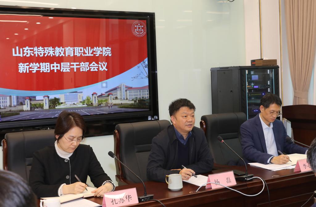 杨磊以“坚定信心、守正创新、真抓实干、规范提升,持续推进学院高质量发展”为主题,对做好全年工作提出明确要求。一要总结成绩,巩固成果,坚定加快发展的信心和决心。过去一年,学院党的领导进一步加强,干部能力显著提升,基层党组织建设不断强化,“一三六六”发展蓝图成功擘画,新校区二期工程全面启用,学院绩效考核和全省高职院校办学质量监测取得良好成绩,这些成绩给了我们进一步推动发展的强大信心。二要认清形势,凝神聚力,增强推进改革发展责任感使命感。深入学习贯彻习近平总书记在全国教育大会上的讲话精神,认真学习《教育强国建设规划纲要(2024-2035)》,深刻把握残疾人职业教育和高等职业教育发展形势,明确学院办学定位,加强顶层设计,增强创新发展的能力和勇气。三要突出重点,真抓实干,推进各项工作靶向聚力、精准发力。坚持问题导向,找准工作着力点和突破点,统筹推进学院省级高水平专业群建设、制度建设、文化建设、基层党建工作以及新校区全面运行等重点工作。四要加强领导,狠抓落实,确保各项工作规范提升、落地见效。对年度重点工作进行细化分解任务,明确时间表和路线图。建立项目制管理机制,一抓到底,确保各项工作扎实推进。开展“规范提升年”活动,抓好内涵建设,夯实管理基础。