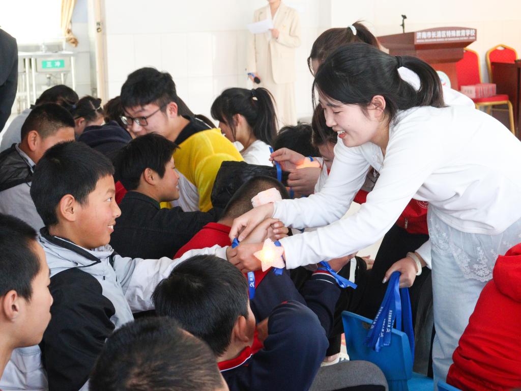 签约当天,特殊教育系师生志愿者与长清区特殊教育学校共同开展了“走进星星世界,用爱融化孤独”主题活动。活动中,志愿者为孩子们系上蓝色丝带,伴随着欢快的《幸福拍手歌》,带领孩子们通过拍手、跺脚、拍肩等动作感受音乐的节奏与律动。与孩子们共绘一幅画,体验创作的乐趣,以实际行动落实对特殊儿童的关心与关爱。