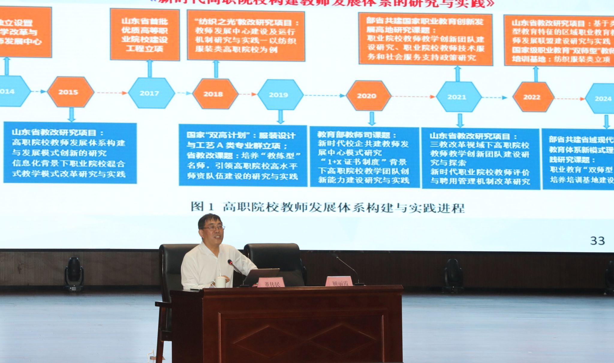 闭幕式上,特邀职教领域专家董传民教授作专题报告。他以《新时代高职院校高质量发展背景下“金师”队伍建设的研究与实践》为题,从六大维度系统剖析了高职院校教师队伍高质量发展的关键路径,为学院“五金”建设与特殊教育师资培养提供了理论与实践指导,同时还结合山东省高职院校办学质量考核指标,提出应动态优化专业群建设,强化产教融合实践基地,并通过“学分银行”制度与分级考核机制,实现教师技术技能与教学能力的双轨评价。他强调职业教育应服务新质生产力培育,通过“金专、金课、金师、金地、金教材”建设,推动知识图谱向能力图谱转化,培养适应数字时代的高技能人才。