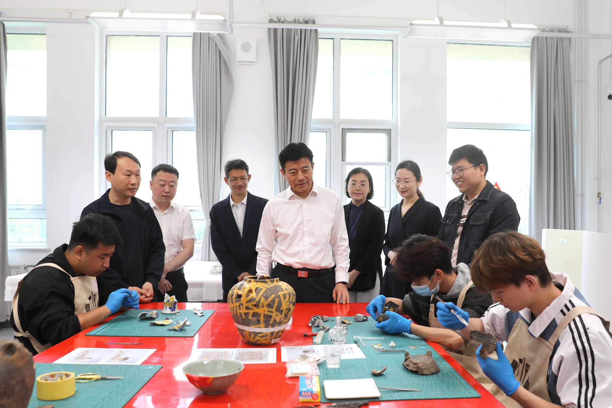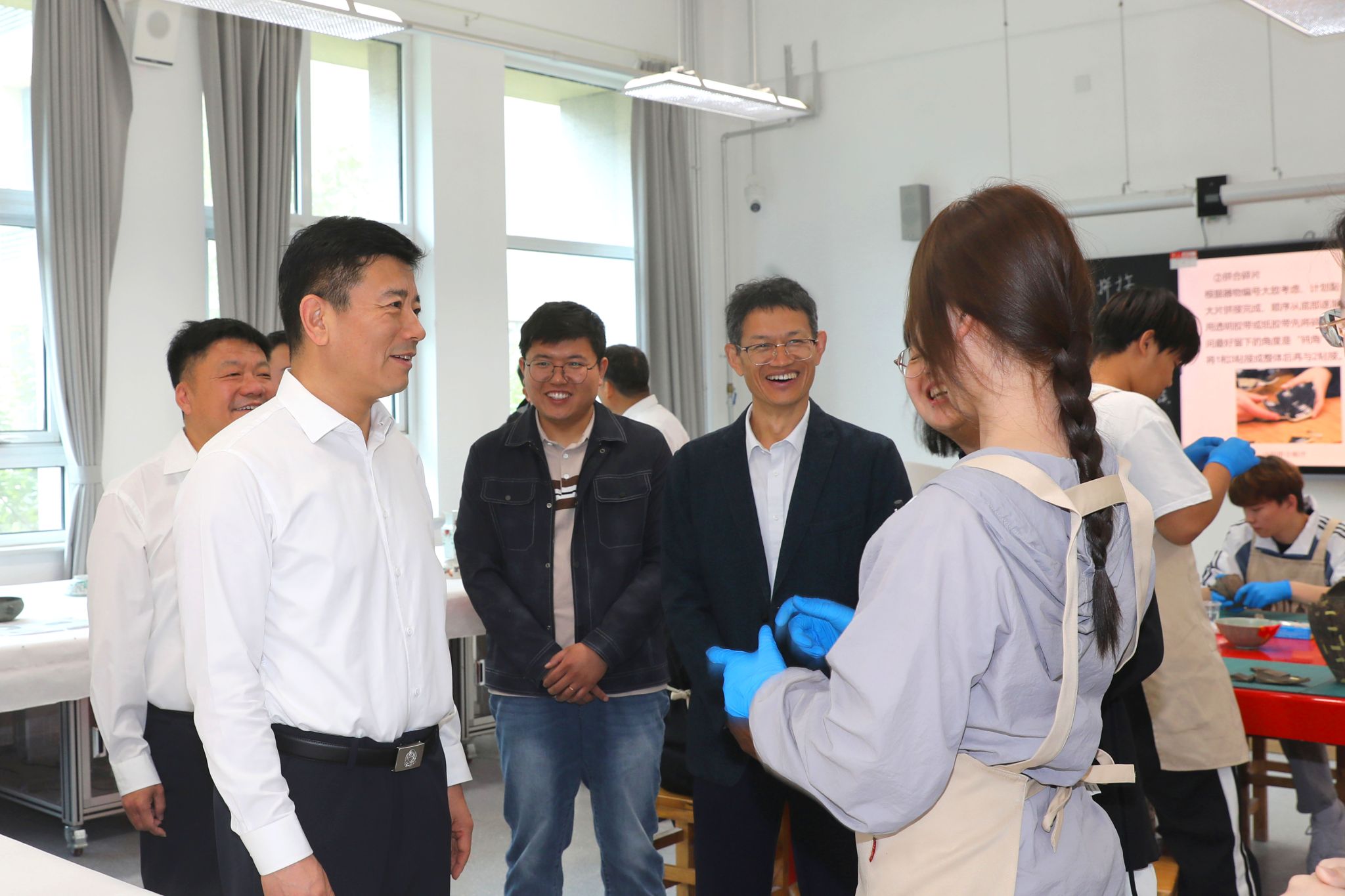 李明一行实地查看听障视障学生实训室、文物修复实训室和图书馆等学习生活场所,参观师生艺术作品展览馆,观摩学生课堂实践,与师生进行亲切交流,深入了解学院专业设置、师资配备、校企合作、学生学习生活以及实习就业情况,对学院的教育教学工作和师生奋发向上的精神面貌给予肯定。