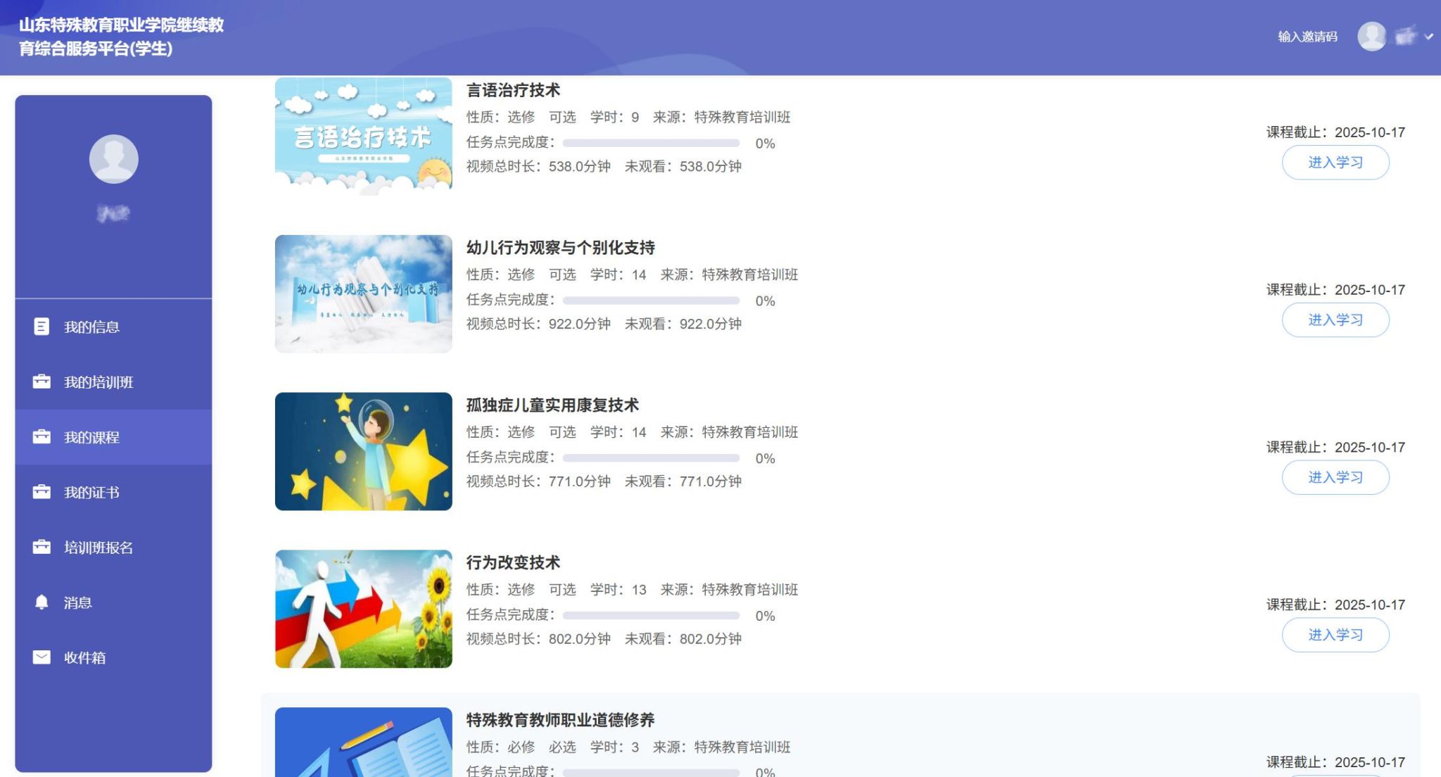 本次培训充分优化平台功能、报名流程和课程体系建设,依托学院教育康复高水平专业群课程资源,利用“互联网+继续教育”优势,开展线上培训。医学康复和特殊教育两个班次均设置必修课、选修课,提升了规范化培训程度,学员可根据自身职业特色和培训需求,进行选课培训。同时积极筹备线下培训,计划聘请行业内优秀专家学者担任讲师,采用理论指导+实训操作+经验交流相结合的授课模式,为学员搭建高层次学习交流平台。