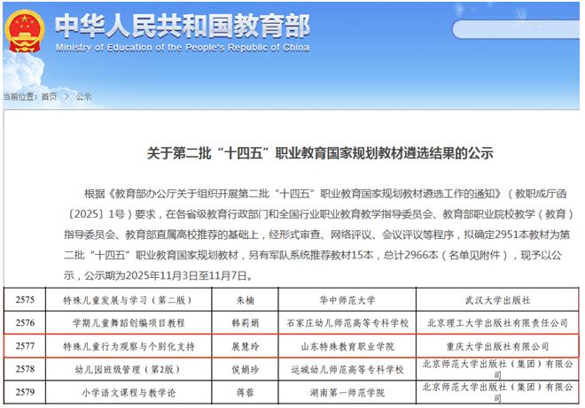 近日,教育部职业教育与成人教育司公示的第二批“十四五”职业教育国家规划教材遴选结果正式发布,kaiyun开云官方在线入口特殊教育系教师展慧玲主编的《特殊儿童行为观察与个别化支持》教材成功入选,这是kaiyun开云官方在线入口在特殊教育专业教材建设领域的又一重要突破,为特殊教育人才培养与行业发展提供了优质教学资源支撑。