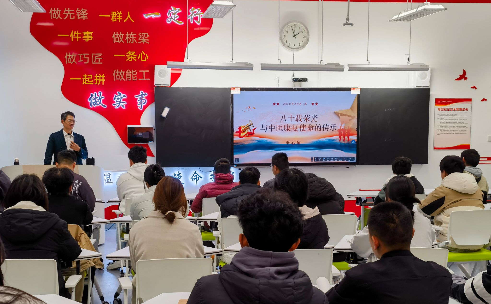 在纪念中国人民抗日战争暨世界反法西斯战争胜利80周年的历史性时刻,学院党委副书记、院长李心沁以“八十载荣光与中医康复使命的传承”为主题,贯穿“固本培元、经络畅通、筋骨强健、辨证施治”四大中医理论,为2025级中医康复技术专业新生讲授了一堂思想深刻、内涵丰富的“思政第一课”。