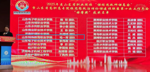 近日,在2025年度山东省职业院校“课程思政研课总会”暨山东省高职高专院校思想政治理论课建设联盟第十次工作年会中,学院信息技术系毛一芳团队凭借出色表现,荣获特等奖;公共教学部张晓亚团队、刘付涛团队双双荣获二等奖。