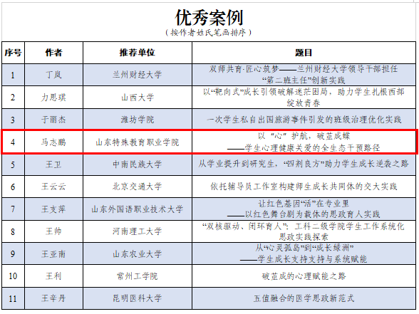特殊教育系辅导员马志鹏撰写的案例《以“心”护航,破茧成蝶——学生心理健康关爱的全生态干预路径》入选优秀案例。案例聚焦升学关键期焦虑躯体化学生的成长困境,创新构建“三阶四维”全生态干预体系,锚定“短期纾困稳情绪、中期筑基建支持、长期赋能助成长”三阶递进目标,构建了心理疏导、家庭赋能、学业帮扶、朋辈支持的四维协同路径。