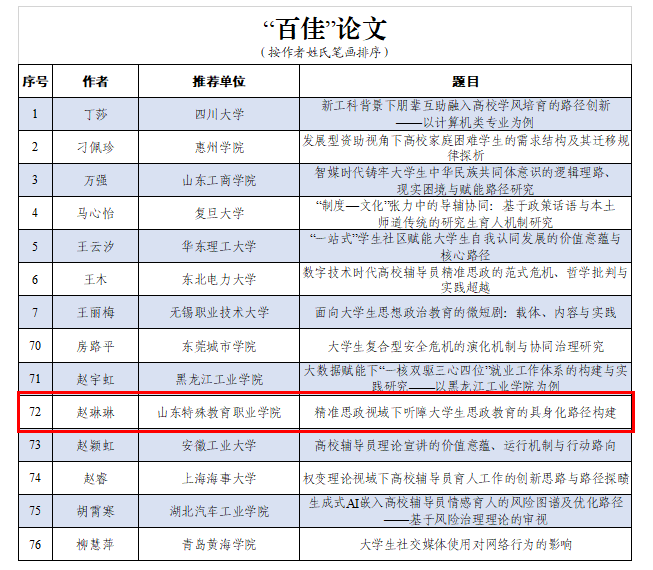 信息技术系辅导员赵琳琳撰写的论文《精准思政视域下听障大学生思政教育的具身化路径构建》入选“百佳”论文。论文立足听障大学生群体特点,将精准思政理念与具身认知理论深度融合,系统构建并实践了“具身化转译—朋辈示范—组织赋能—场域内化”递进式育人路径,有效破解了聋人大学生思政教育中存在的沟通壁垒、圈层固化、认知差异等现实难题。