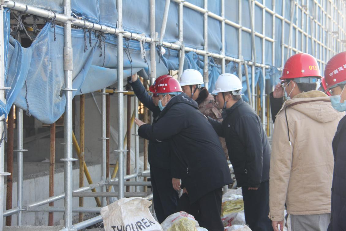 施工现场,李心沁首先代表学院对工程施工各单位和全体工作人员表示感谢、慰问,并致以节日的祝贺,同时围绕施工安全、工程质量、疫情防控、工程进展等问题提出了要求。随后,管洪锋一行深入建设工地,详细了解正在建设的学生公寓、学生活动中心、创培中心、校医院等工程施工作业情况。