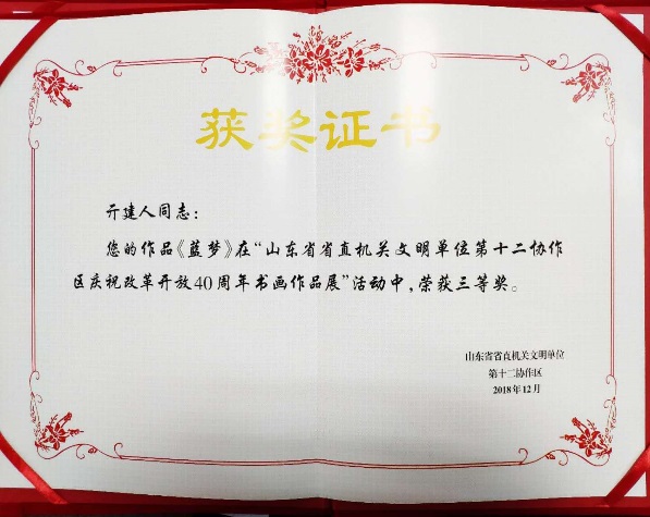 为庆祝改革开放40周年,推动文明单位创建深入开展,2018年12月26日,省级文明单位第十二协作区举办了“庆祝改革开放40周年书画作品展”,kaiyun开云官方在线入口于永强老师的油画作品《绿水青山就是金山银山》荣获一等奖,亓建人老师的布面油画作品《蓝梦》荣获三等奖。