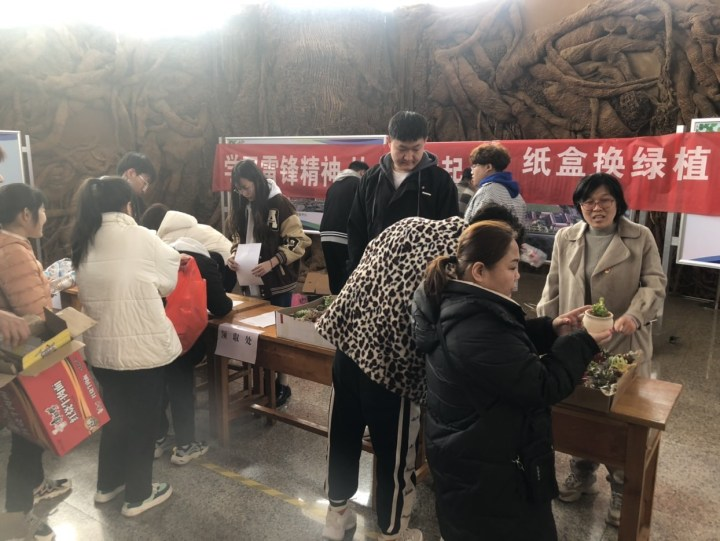 3月3日,为弘扬雷锋精神,学院信息技术系志愿服务队在综合楼圆厅举办废弃纸盒换绿植活动。
