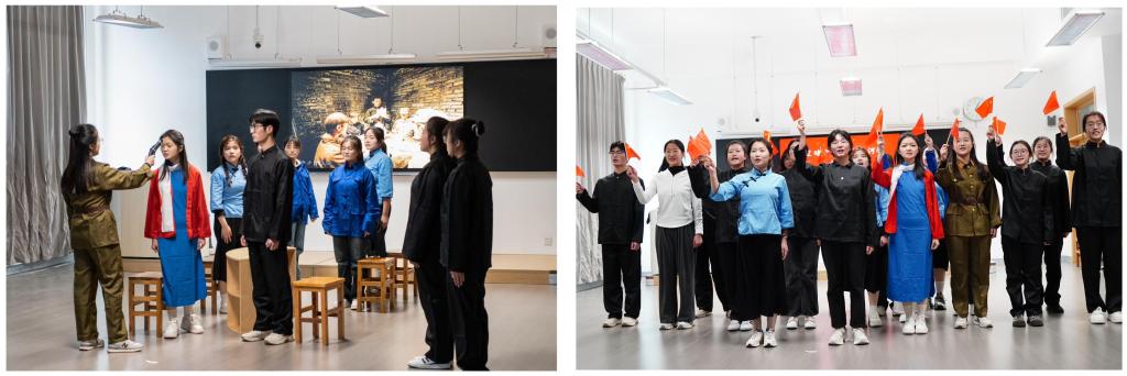 此次读书分享会以《天晓:1921》为主线,通过多种形式带领师生们全方位、沉浸式了解中国共产党创建的伟大历程,深切感悟共产党人的初心使命、理想与信念。在“剧之天晓”环节,同学们自编自导自演的《红岩》《陈望道与<共产党宣言>》《铁血魂》三个话剧片段将活动推向高潮。舞台上,演员们真挚的感情、精彩的对白、精准的人物形象刻画、极具感染力的动作与默契的配合,展现出革命年代最激昂的风采,让现场观众为之动容。