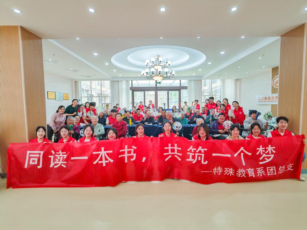 在马山敬老院,特殊教育系“青暖桑榆”志愿服务队与老人们同唱《我和我的祖国》《团结就是力量》等歌曲,与大家共读《红岩》,并将书中精彩片段以话剧形式进行演绎,同学们以真挚的感情、精彩的对白、精准的人物形象刻画,让现场观众置身阅读盛宴,沉浸式体会革命先辈们的坚定信仰与大无畏精神;与社区老人一起做团扇、聊家常,现场氛围其乐融融,共筑红色基因的传承梦。