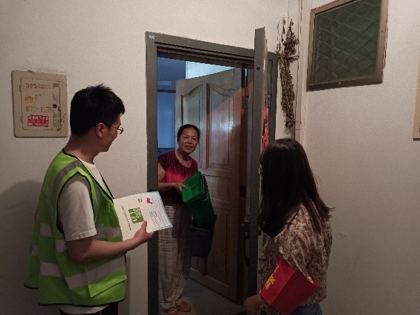 志愿者们在学院教工住宅区设置垃圾分类知识宣讲点,发放常识宣传单,向居民师生普及生活垃圾减量与分类知识,现场讲解如何正确识别分类标识,如何进行垃圾分类,区分可回收物、其他垃圾、厨余垃圾、有害垃圾。为广泛宣传发动,增强活动效果,志愿者们还深入家属楼进行入户宣传,分发了分类垃圾桶和垃圾袋