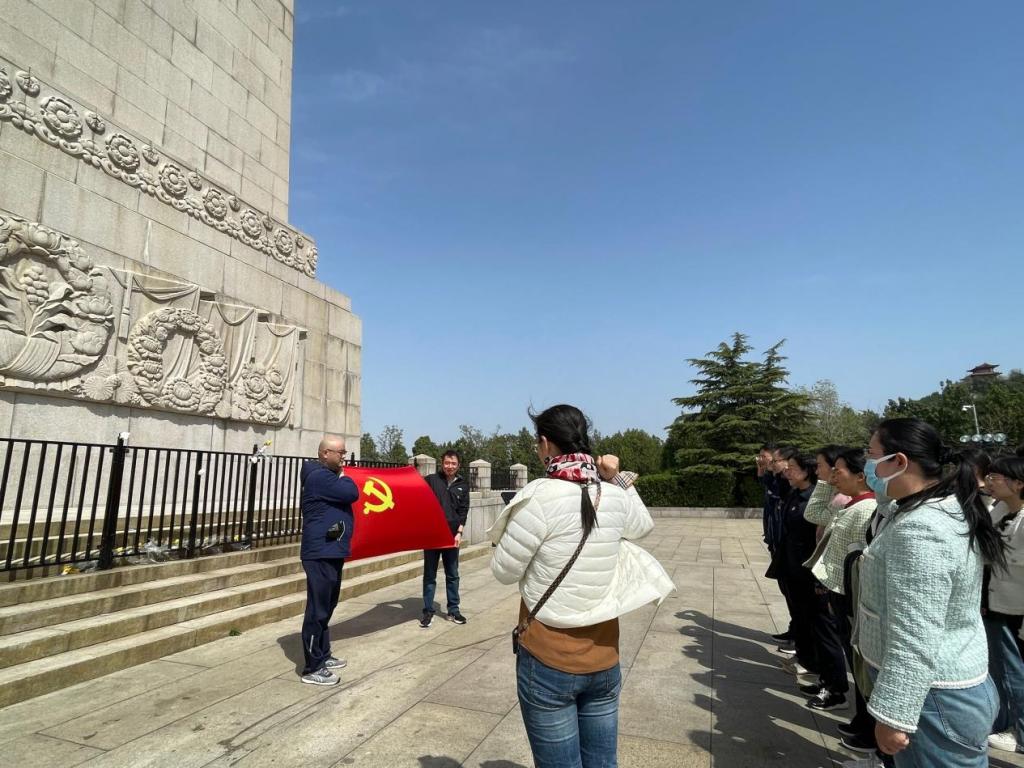 在革命烈士纪念塔前,全体党员高举右手,面向党旗重温入党誓词,在踏寻红色足迹中感受信仰力量,在重温历史中接受革命传统教育。